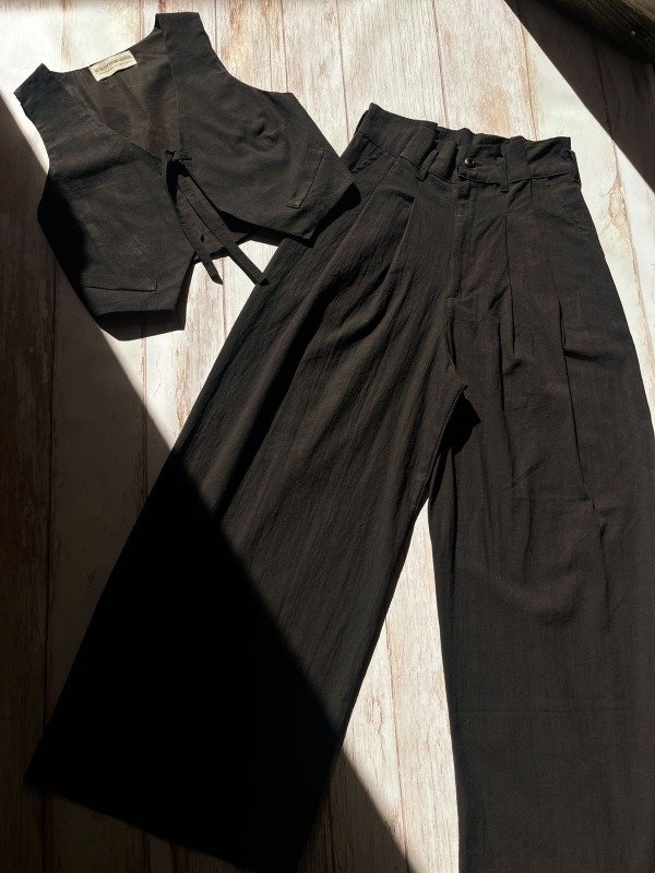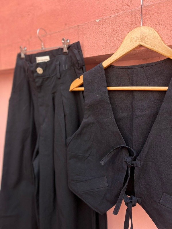 Chaleco: Es una pieza distintiva que complementa el pantalón con un ajuste entallado en el busto gracias a sus pinzas. El chaleco se adapta perfectamente a diferentes estilos de tops o camisas debajo, ofreciendo múltiples opciones de uso.