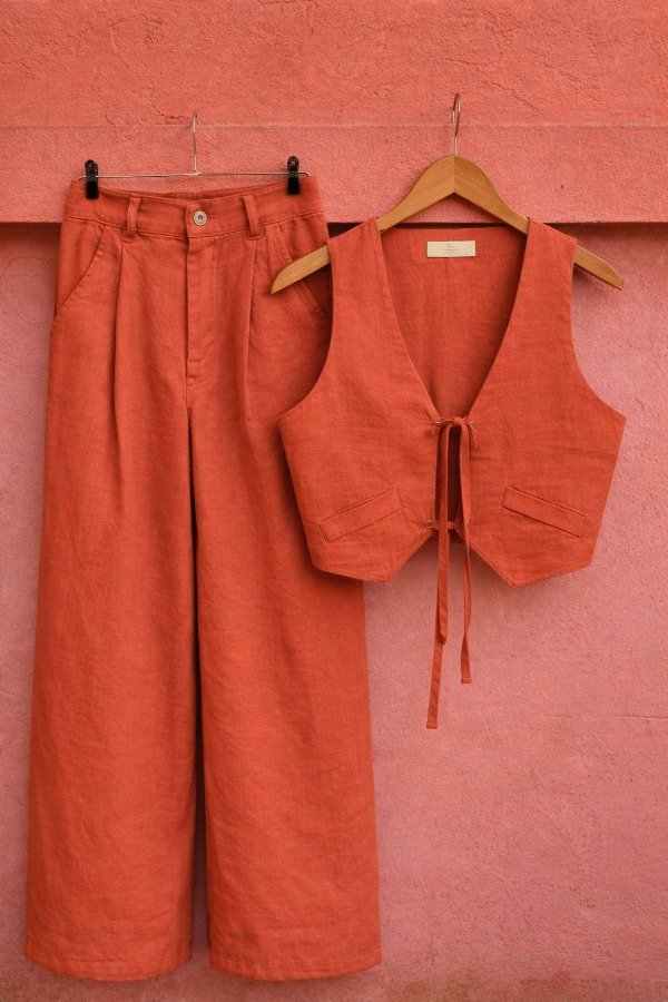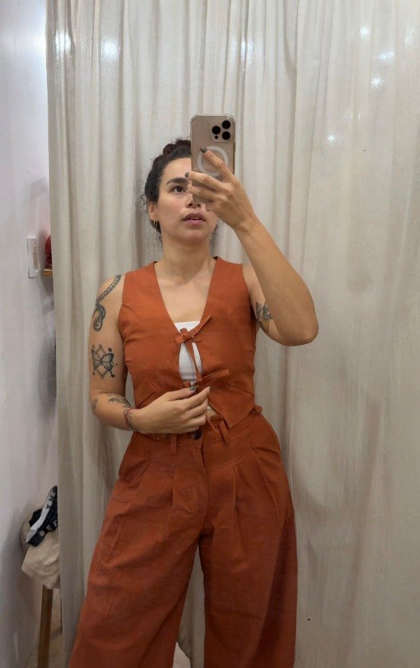 Chaleco: Es una pieza distintiva que complementa el pantalón con un ajuste entallado en el busto gracias a sus pinzas. El chaleco se adapta perfectamente a diferentes estilos de tops o camisas debajo, ofreciendo múltiples opciones de uso.