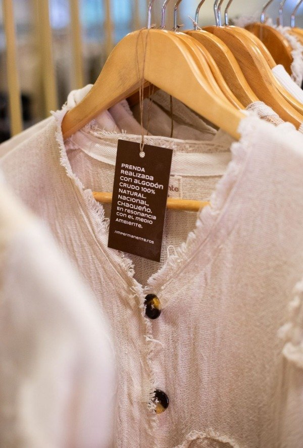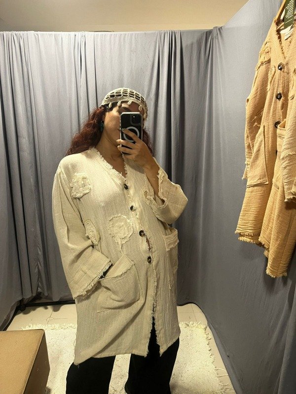saco tramado en algodón, fiel al telar ancestral, implica la creación de un saco utilizando la técnica del tejido a mano con hilos de algodón, donde la urdimbre y la trama se entrelazan siguiendo patrones que evocan la tradición de los telares ancestrales.