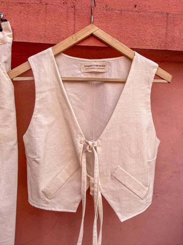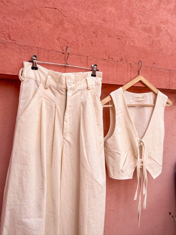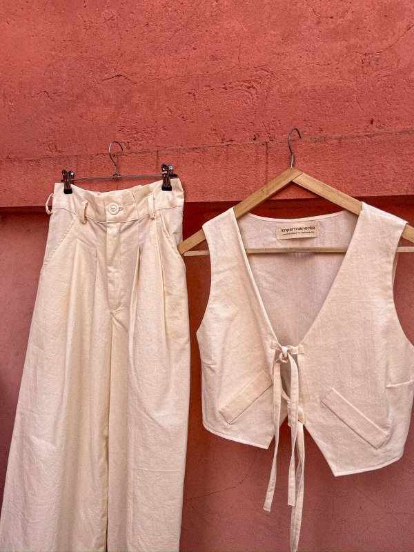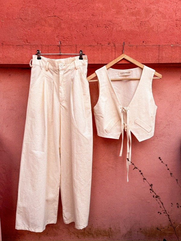 Chaleco: Es una pieza distintiva que complementa el pantalón con un ajuste entallado en el busto gracias a sus pinzas. El chaleco se adapta perfectamente a diferentes estilos de tops o camisas debajo, ofreciendo múltiples opciones de uso.