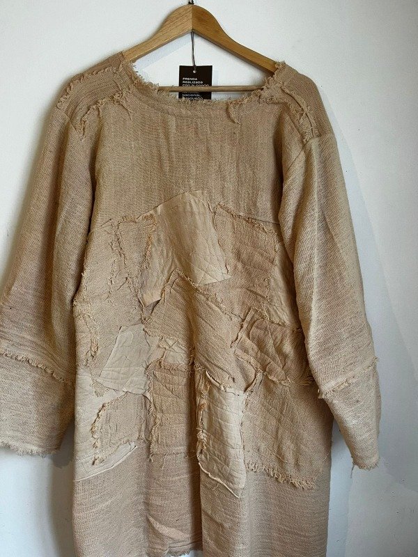 saco tramado en algodón, fiel al telar ancestral, implica la creación de un saco utilizando la técnica del tejido a mano con hilos de algodón, donde la urdimbre y la trama se entrelazan siguiendo patrones que evocan la tradición de los telares ancestrales.