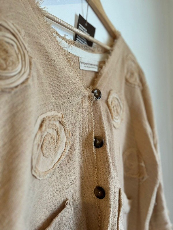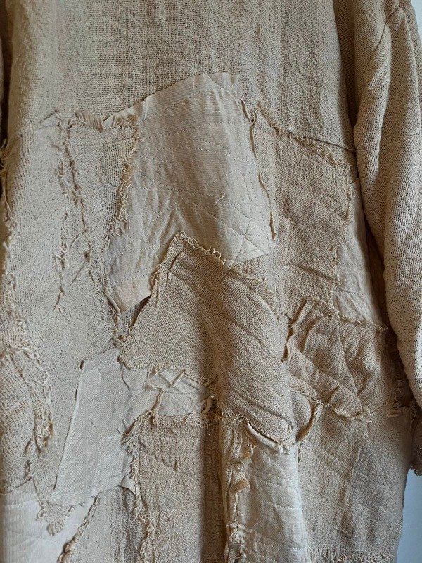 El corte es estilo saco chaqueta, con hombros caídos. Teñido a mano con cascara de cebolla.